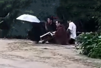 由于连续降雨,老人家中附近道路地势低洼,蹒跚赶到时,已经水势及腰。吴明辉赶忙和村民一起将老人抬至安全地带。老人顺利脱险。