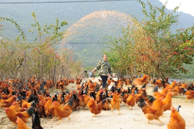 山里林多、花多、果园多,养鸡正合适。在中国人寿扶持下,黄保全、隆小春夫妇引进花海生态土鸡养殖项目,鸡都在花下散养,以花瓣和昆虫作为天然饲料,养出来的土鸡肉质甜美鲜嫩,“我的基地年出栏土鸡1万羽以上,区内外客户都到我这里买鸡,订单不断,常年供不应求。”黄保全看着满地红彤彤的年鸡,难掩喜悦之情。